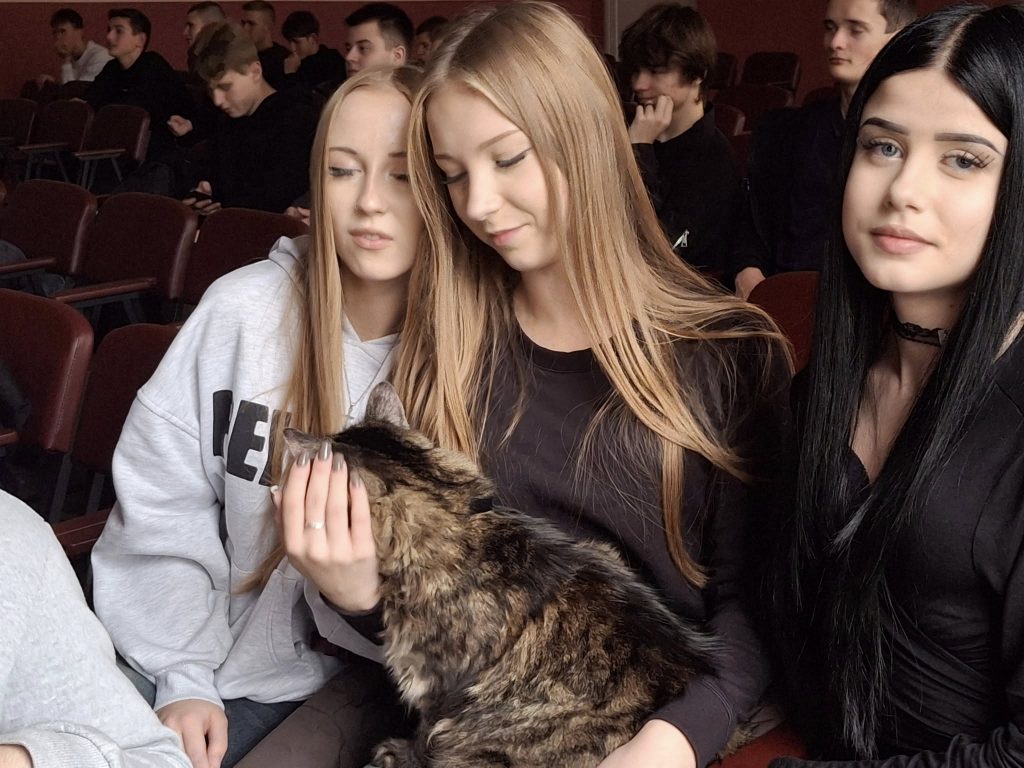 Кульмінацією виховної години стала зустріч з незвичайним гостем – котом Славіком та його хазяйкою, Аллою Петрошук, очільницею ЗПФК. Славік – це не просто домашній улюбленець, а справжній герой-переселенець, який був евакуйований з прифронтового Слов’янська. Алла Володимирівна поділилася зворушливою історією порятунку, підкресливши, наскільки важливою є підтримка та любов.